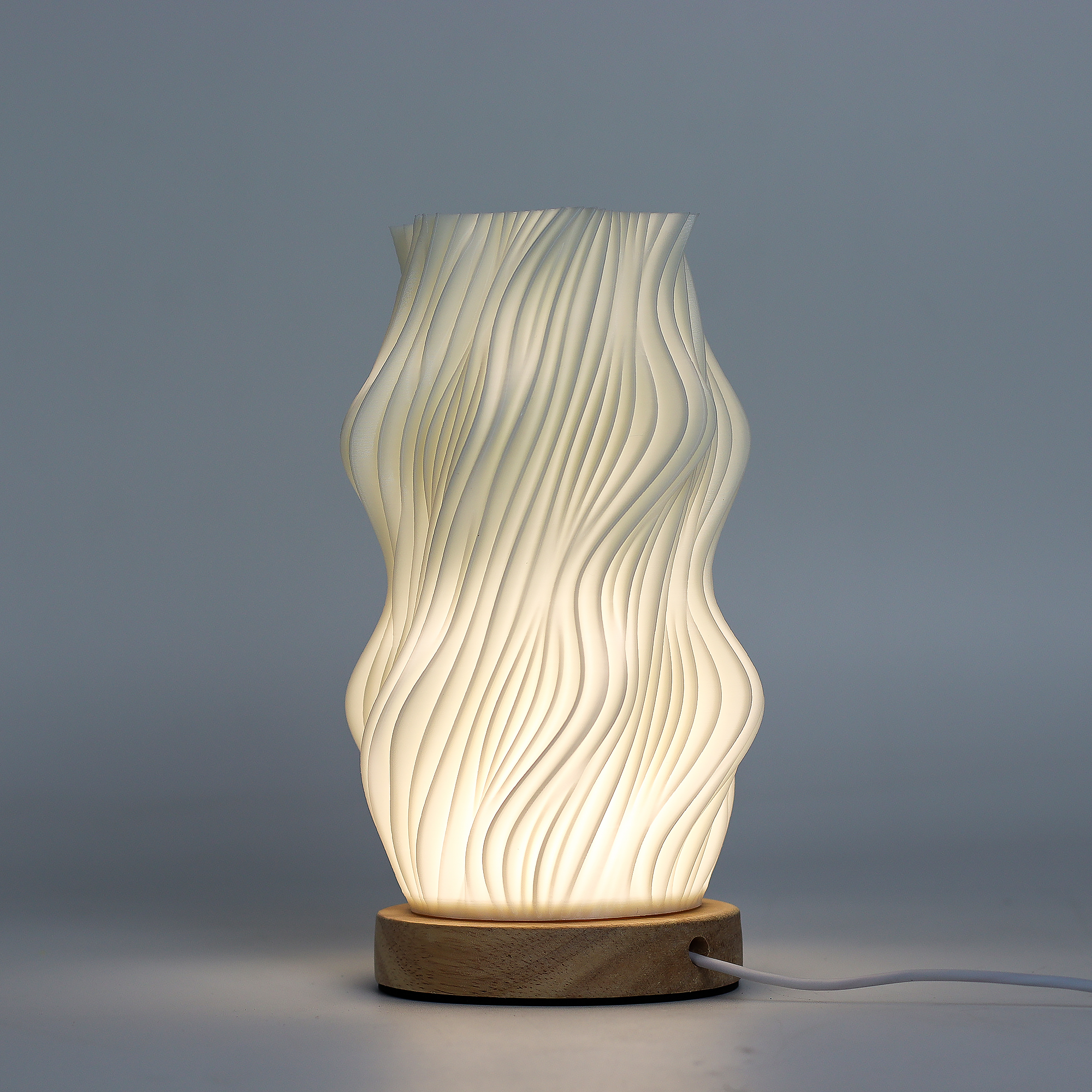 New Wave Lamp kombinerer skulpturell design med funksjonalitet. Den kompakte lampen gir mykt, stemningsfullt lys og fungerer samtidig som et dekorativt element. Lampen er 3D-printet med presisjon og har en base i naturlig tre, som tilfører varme og passer perfekt til nordiske, japandi- og moderne interiører.