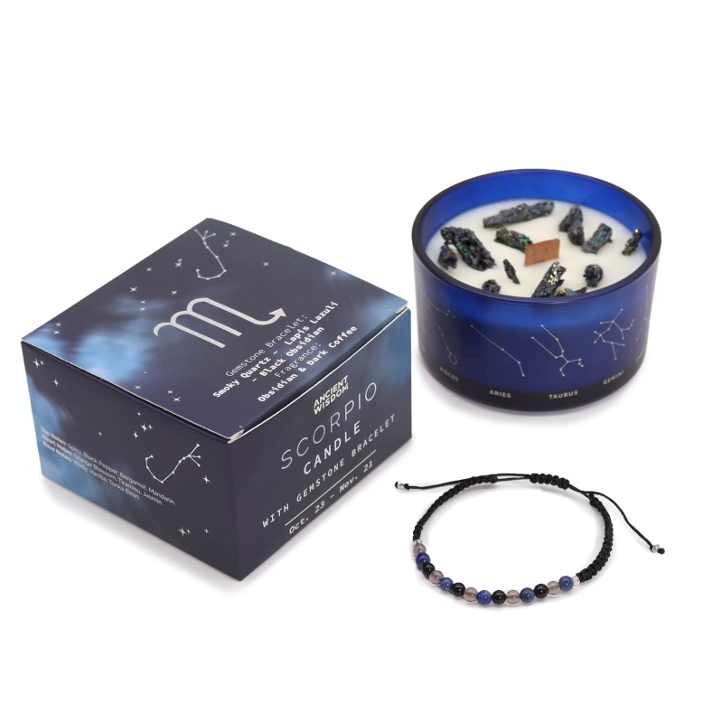 Settet inkluderer et armbånd med røykkvarts, lapis lazuli og svart obsidian, nøye valgt for å støtte Skorpionens kraftfulle og magnetiske natur. Røykkvarts gir beskyttelse og jordforbindelse, lapis lazuli fremmer visdom og selvuttrykk, og svart obsidian støtter dyp helbredelse og transformasjon. Lyset er dekorert med ekte peruansk pyritt, som sies å øke fysisk utholdenhet, mental klarhet og tiltrekke velstand og overflod.
